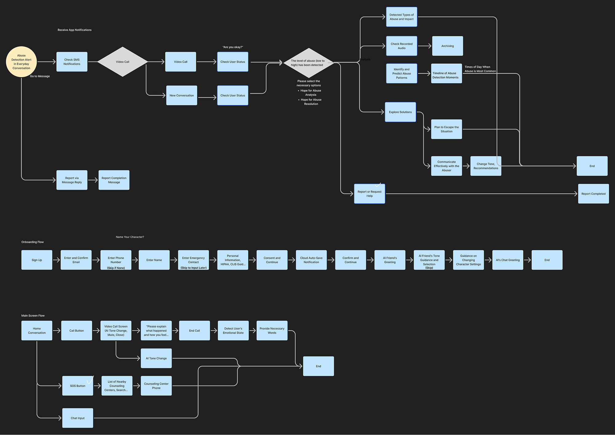 I designed two flow versions to match urgent versus less urgent situations and focused on practical steps users can take with their AI companion.