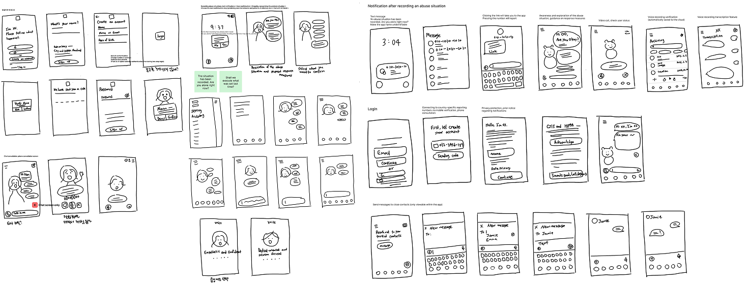 I sketched designs that look like normal chat apps to stay hidden. Through Crazy 8s, I explored ways to enable quick emergency reporting while keeping the interface unnoticeable to abusers nearby.