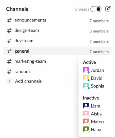 Hover over dashboard channels to instantly see active / inactive members and total count.