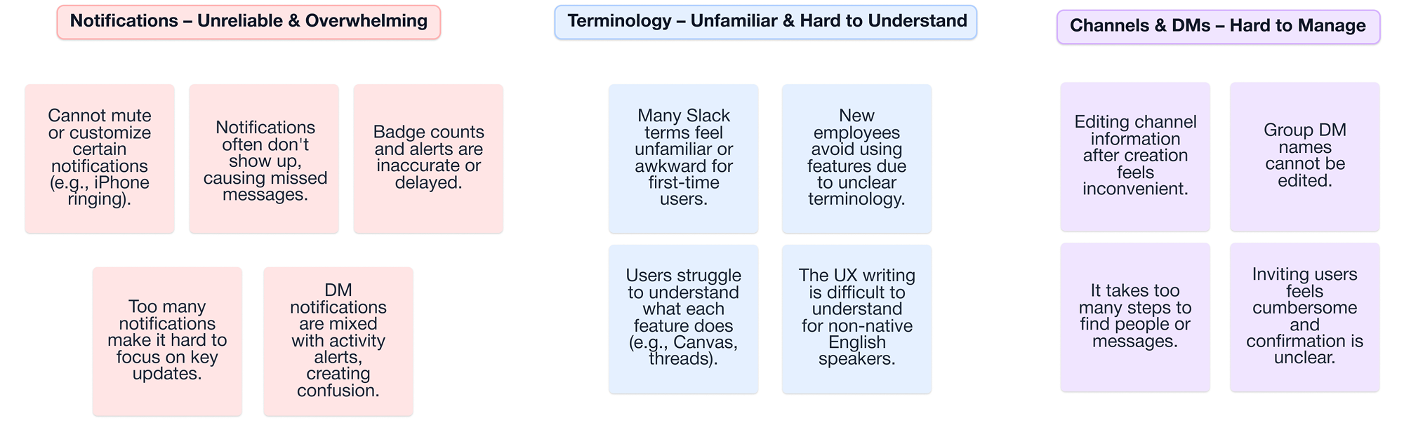 New users struggled with Slack’s terminology and often missed important notifications.