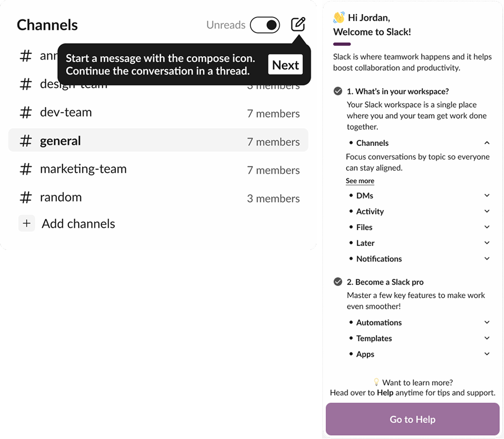 First-time users could navigate Slack more easily thanks to the redesigned onboarding.