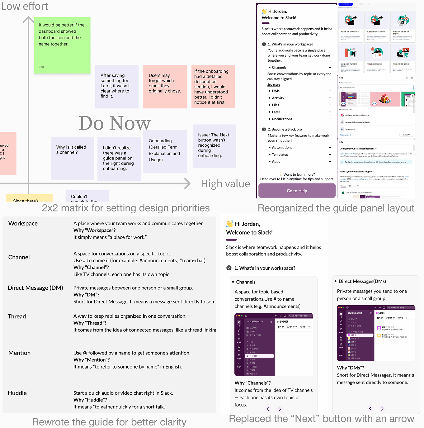 We used the remaining time to improve the design based on data and user feedback, prioritized the onboarding guide and UI visibility with a 2×2 matrix, simplified the guide, and replaced the “Next” button with an arrow icon for clarity.
